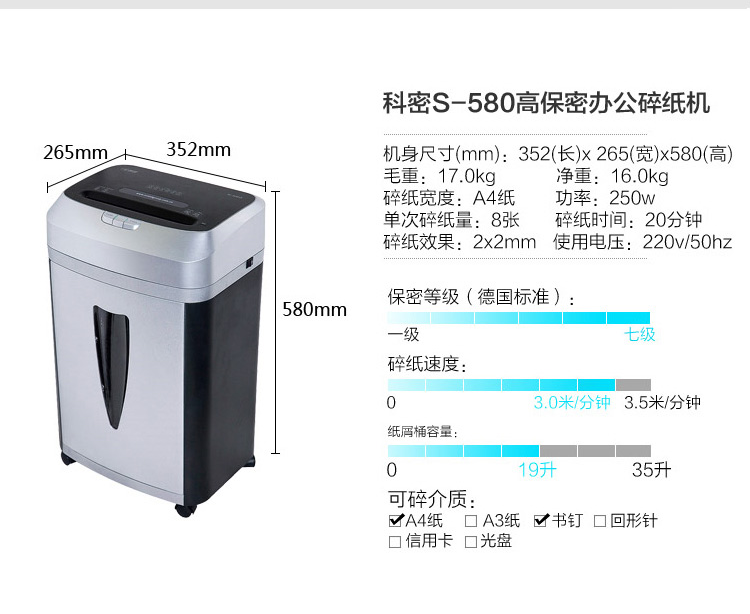 科密S-580碎纸机 粉尘级细小颗粒高保密中大型大容量办公8张