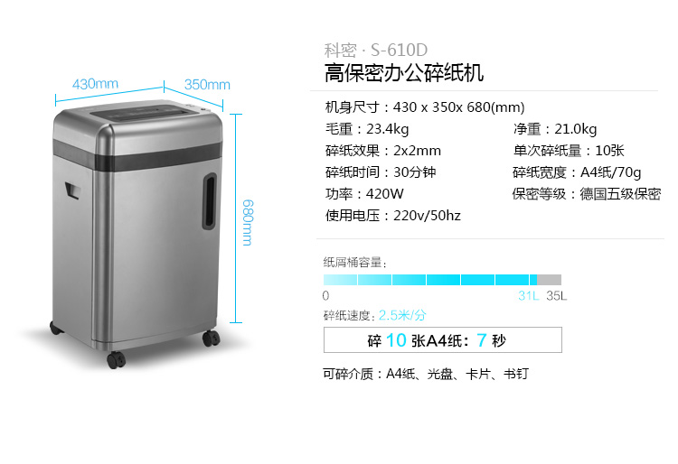 科密S-610D 大型粉尘级2*2mm高保密碎纸机 大容量办公粉碎机